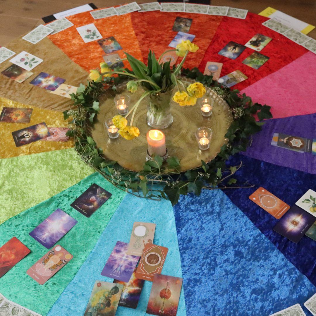 De volgende ochtend reiken Arianne en ik de kleurentesten uit die de deelnemers van tevoren thuis hebben gemaakt. Elke deelnemer ontvangt haar eigen persoonlijke kleurenprofiel: een kleur voor het diepste verlangen, een kleur voor succes, een kleur voor geluk, een kleur voor de beste versie van zichzelf en een kleur voor die beste versie in balans. Het is knap hoeveel dat zegt. Kleur maakt zichtbaar wat nog geen woorden heeft en dat is precies wat we hier komen doen.